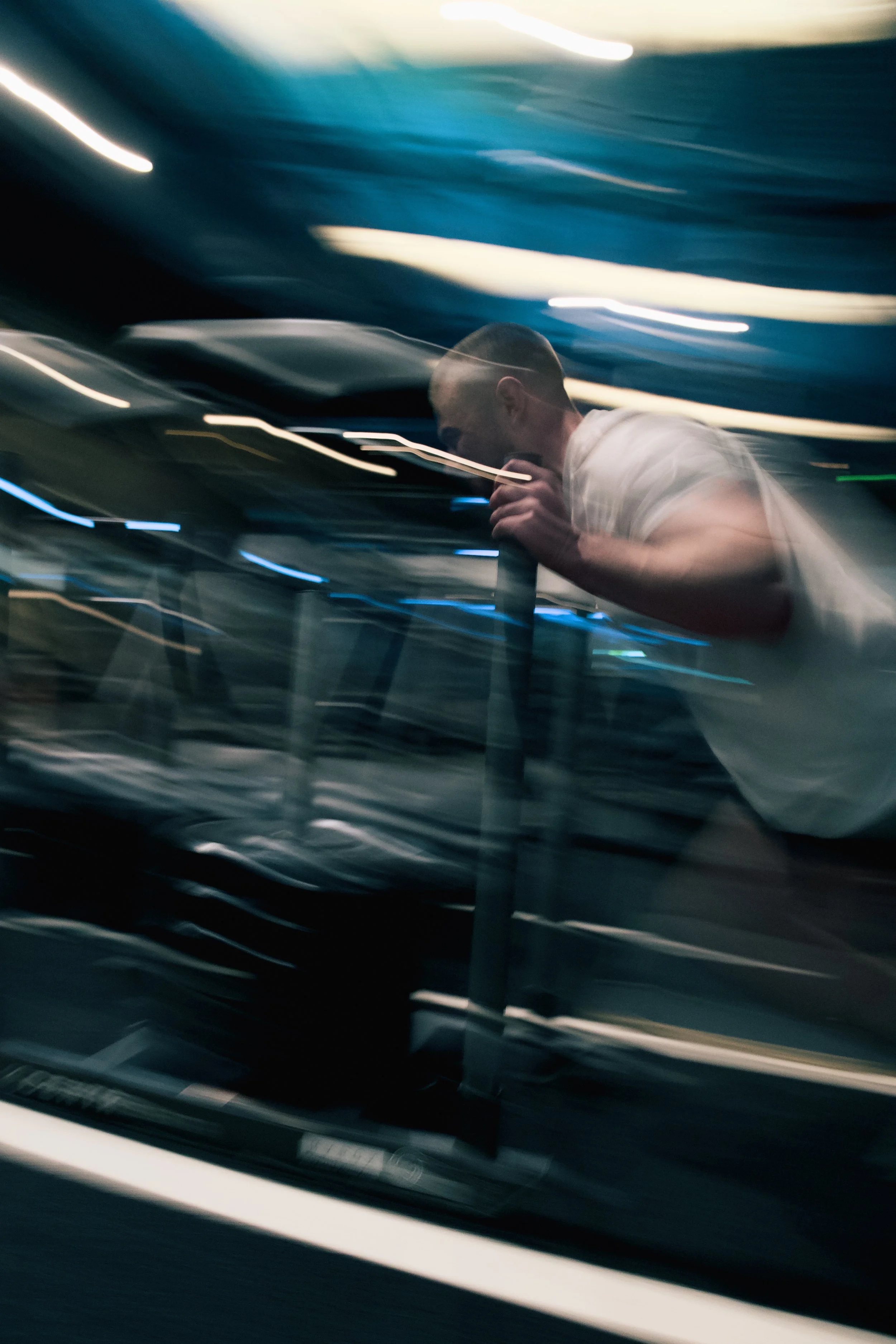 A black and white photo of a young man lying on a wooden surface outdoors, with light highlighting his face and short hair, blurred background with bokeh effect.