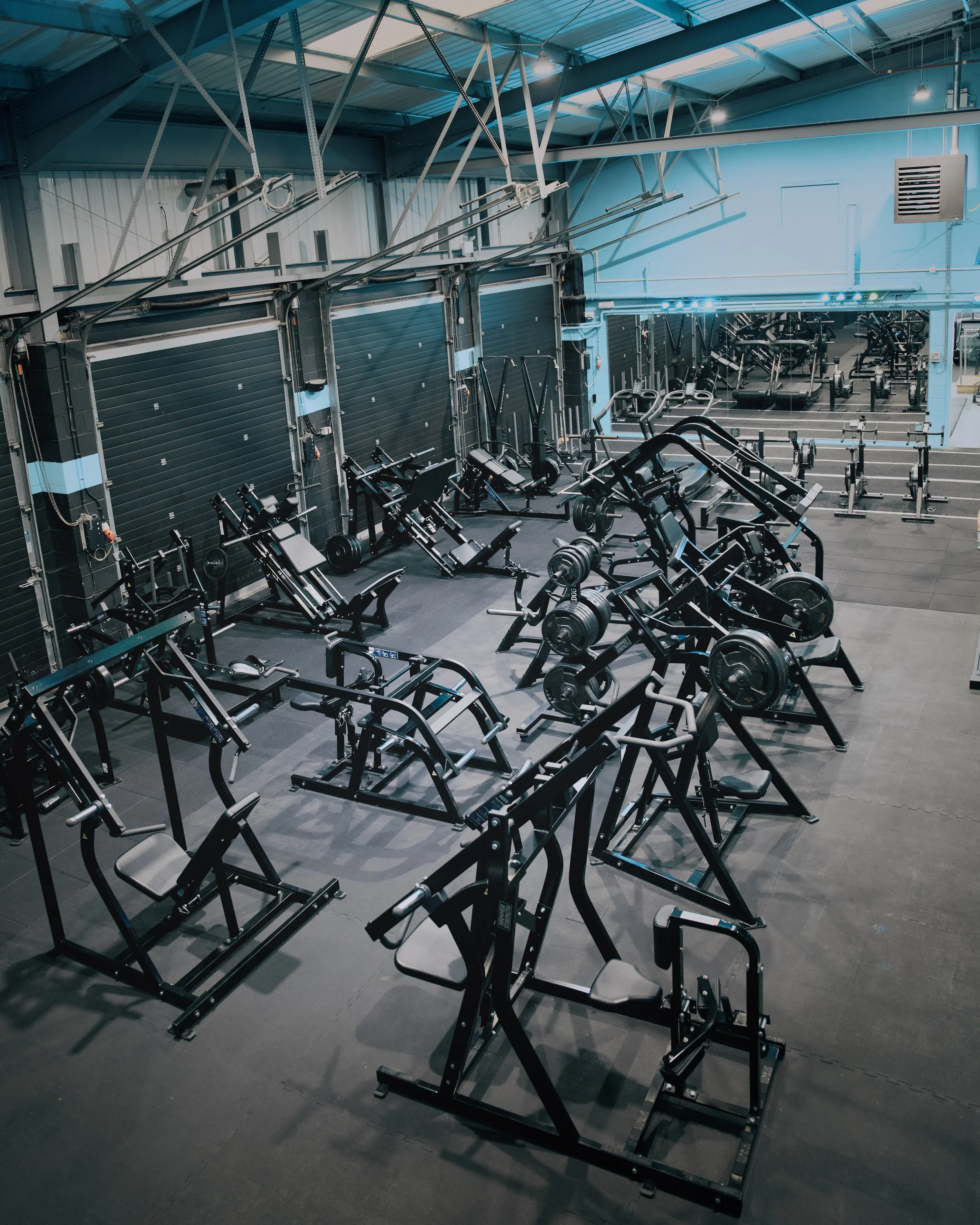A person wearing a black shirt with pink text, boxing gloves on, and boxing in a dark gym with punching bags and boxing equipment.